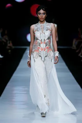 Priyo Oktaviano menggebrak dengan koleksi “Galore”. Sesuai artinya, koleksi ini tampak sangat megah. Terinspirasi oleh gaya arsitektur french baroque, Priyo menampilkan koleksi androgini layaknya seragam perang para prajurit Napoleon. Namun kolaborasi warna hitam dan emas yang disertai aksen studded pada busananya ini tetap tampil feminin karena campuran ruffles yang flamboyan.