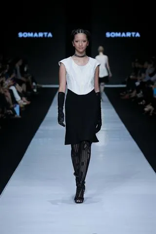 Somarta presented the collection full of Japanese influences. The black and white pieces were ornamented by obi. The gold, flower and fringe details made the mini dress, skirt, and top looked more artistic. (Shinta/Pesona)