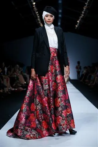 Iranty Purnamasari opened the show by her collection with white, black and red shades with rose motif in almost of all clothing that was displayed. Classic, long lasting, elegant, lady look and easy to mix and match were her signature. Big size pearl necklace which adorned the most of her collection signified the classic and long lasting. Wide brim hat which completed the veils, added the classic impression. Blazer, coat and bolero mixed with trousers, maxi skirt and abayas. This collection suited for active and dynamic Muslim.