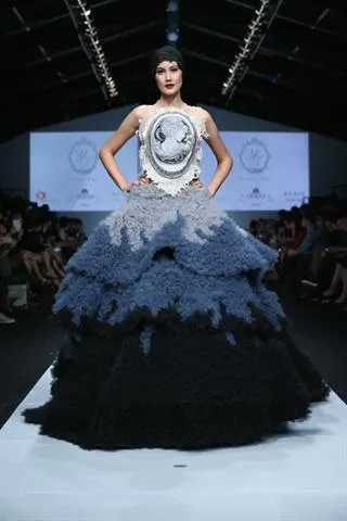 The show started with nine semi-evening gowns which were dominated by white and gray colors. White and gold accents were visible around the chest and neck areas. Next, the designer displayed twelve evening dresses, all of which were sleeveless long dresses in colors like black, brown, and gray. The second set of dresses also had some white and gold accents, but this time around the chest and shoulder areas. The show was closed with a set of wedding dresses, Tan’s area of expertise. Three white wedding dresses looked elegant in Victorian style.
