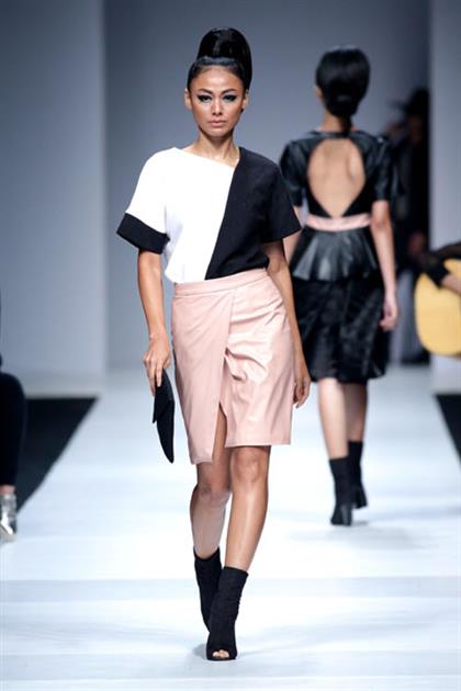 Up next came a number of straight dresses with minimalist silhouette. They were still dominated with black and white colors, but they appeared more feminine with a block of baby pink accents here and there, such as on the shoulder or the skirt. This session gave a new face to THE EXECUTIVE, which is known for their formal designs. ISIS also played around with simple short skirts matched with preppy tops or soft pink sweaters combined with short pants. Casual and neat at the same time.