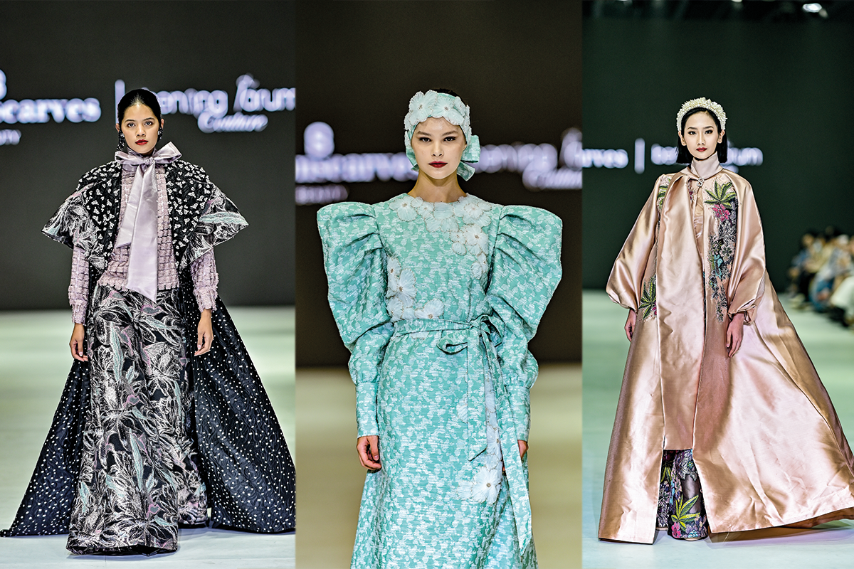 Berbagai A-line dress yang menyapu lantai, outerwear model structured, detail lengan bervolume, bolero, hingga atasan berdetail pita besar khas Benang Jarum Couture tampak mendominasi runway. Semuanya tampil memikat dengan berbagai nuansa champagne, burgundy, rose gold, gold, pastel green, clean white, hingga soft black.