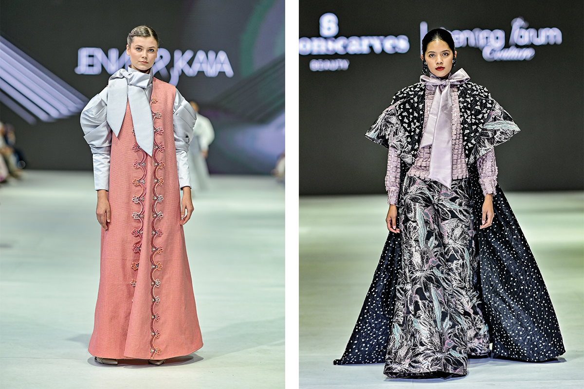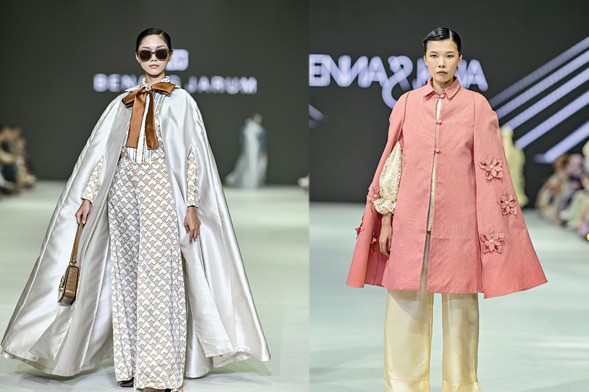 Jenama Benang Jarum memiliki pendekatan lebih megah pada desain A-line cape. Penggunaan bahan satin mengilap dipadukan dengan setelan bermotif di dalamnya.