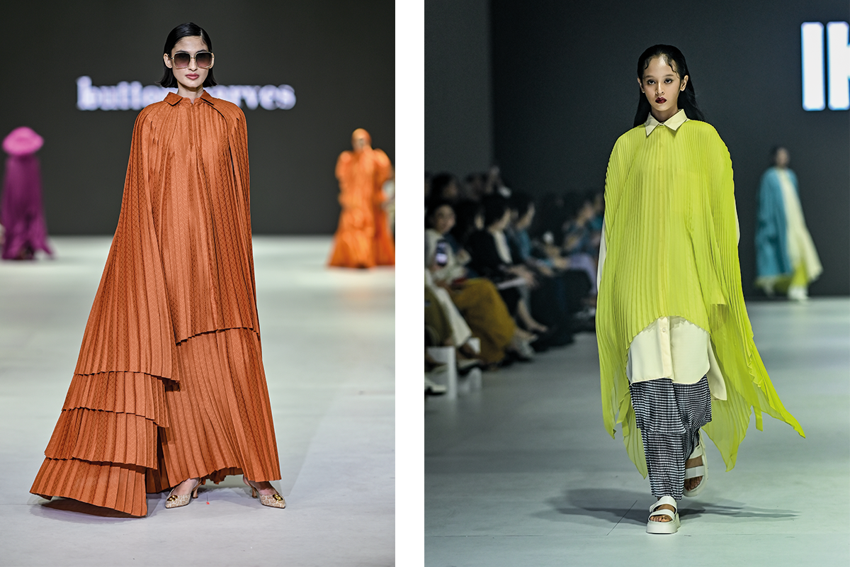 Kini aplikasi bahan pleats yang diterapkan ke dalam model busana yang menyerupai jubah, jatuh dengan anggun namun tetap edgy. Pemilihan warna solid yang ber-statement ditambah dengan efek garis-garis vertikal dari bahan pleats akan memberikan kesan jenjang bagi pemakainya. Jenama modern modestwear IKYK dan Buttonscarves memasukkan teknik lipit khas ini ke dalam barisan koleksi mereka di Jakarta Fashion Week 2024.