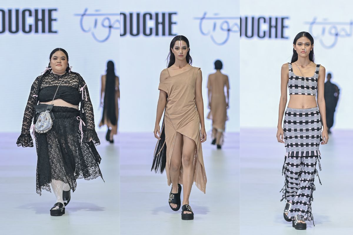 Warna-warna netral, seperti hitam, putih, dan cokelat muda juga hadir pada koleksi dari DOUCHE X Tigah Home untuk JFW 2024. Busana-busana berdesain unik dari DOUCHE berpadu apik dengan footwears khas Tigah Home dalam koleksi berjudul AttraversiamO.