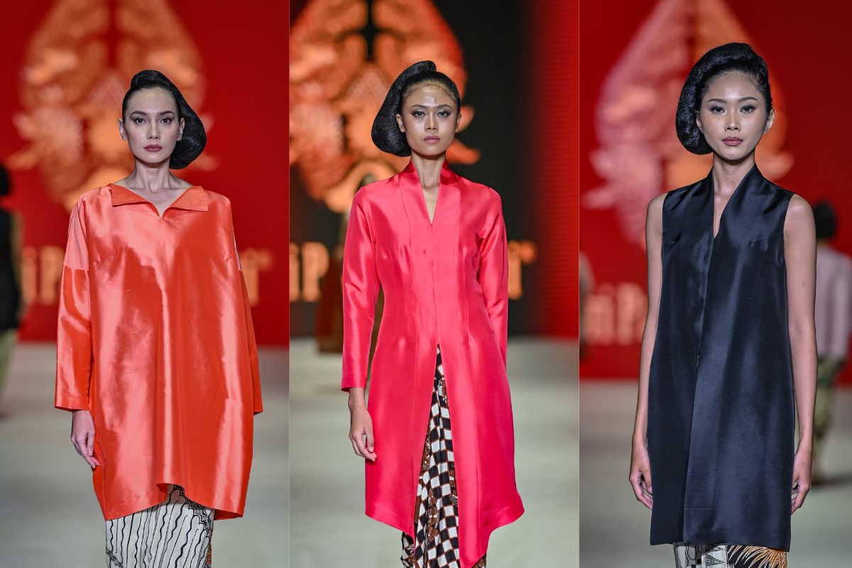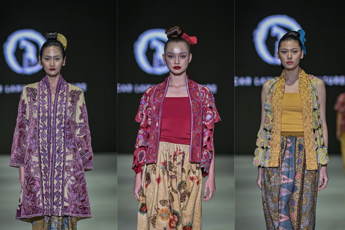Ada juga kebaya lengan panjang dan sleeveless dilengkapi tumpal sepanjang lutut. Semuanya dipadukan dengan bawahan berupa kain batik yang dililit secara tradisional maupun dibuat longgar seperti rok yang mengembang. Penggunaan warna-warna yang cantik pada kebaya dan kain batik bawahannya membuat apik seluruh looks yang ditampilkan.
