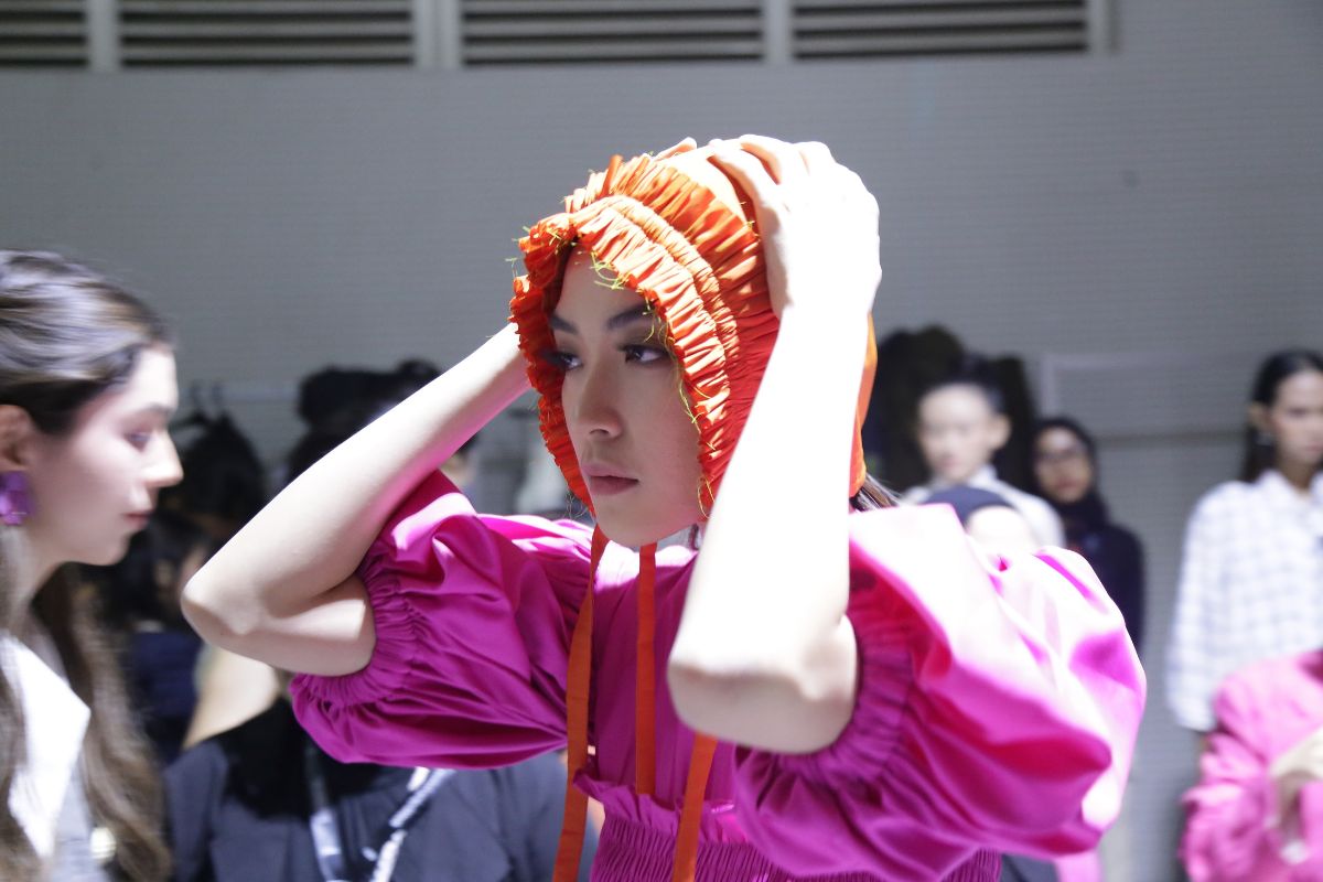 (Model di backstage show LPM 2023 pada JFW 2024 bersiap menampilkan koleksi Thiya)