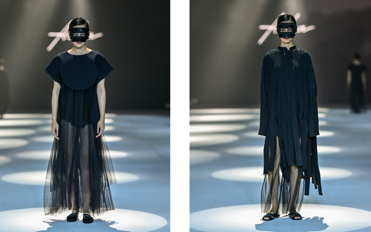 Model-model juga dilengkapi dengan aksesori berupa masker atau tameng wajah di sekitar area mata yang terbuat dari bahan hitam dihias oleh manik-manik sequin bermotif. Aksen tambahan ini memberikan nuansa futuristik dan misterius pada presentasi koleksi ini.
