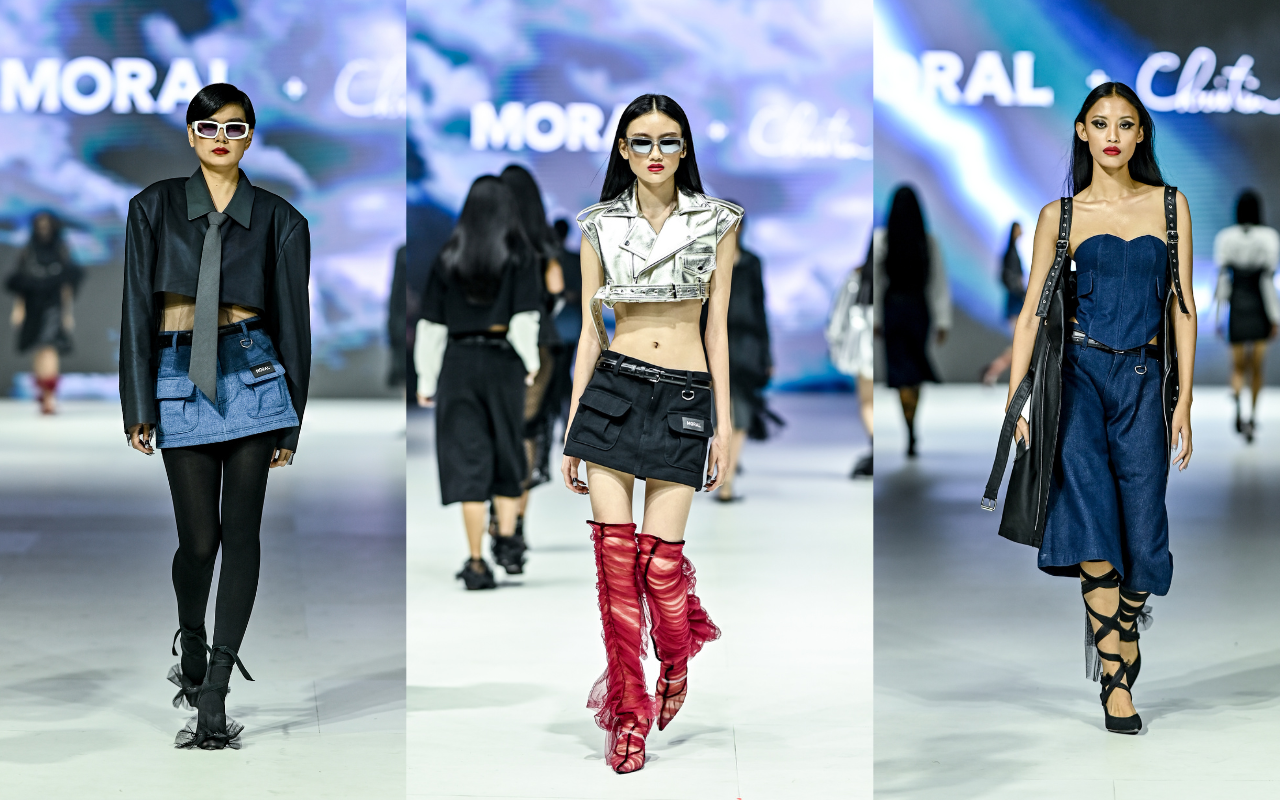 MORAL banyak menghadirkan artikel pakaian yang memiliki siluet kuat seperti cropped biker jacket yang hampir mencapai garis bawah dada, dipadukan dengan rok kulit yang juga amat sangat pendek. Terdapat signature biker vest mereka yang dari segi potongan dan detail telah semakin diperbaharui. Warna yang dibawa memang cenderung edgy dan futuristik seperti hitam, merah, dan chrome silver solid.