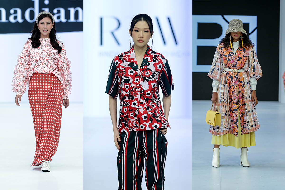 (Foto: Dari kiri ke kanan, koleksi motif floral berpadu dengan motif grafis dari Nadjani, RTW, dan Benang Jarum)