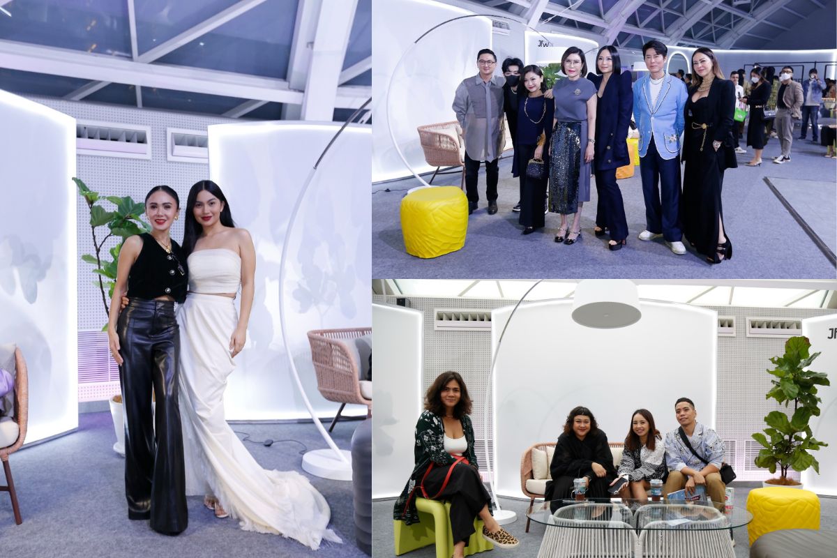 (Foto: Para tamu berfoto di depan dekorasi yang terbuat dari Cellux Stretch Ceiling dari PT Alco Langit Semesta di VIP Longue JFW 2023)