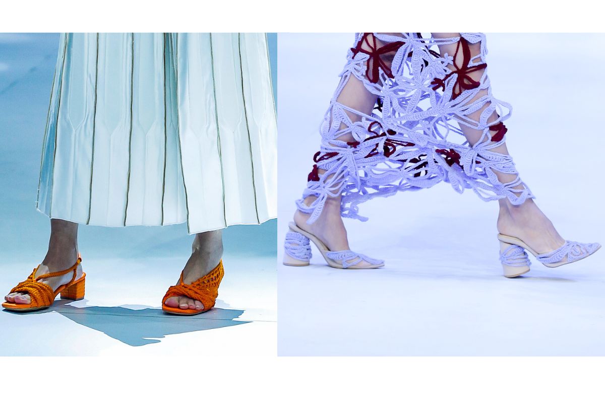 (Foto dari kiri ke kanan: Macrame footwear dalam show Jeffry Tan dan ANW)