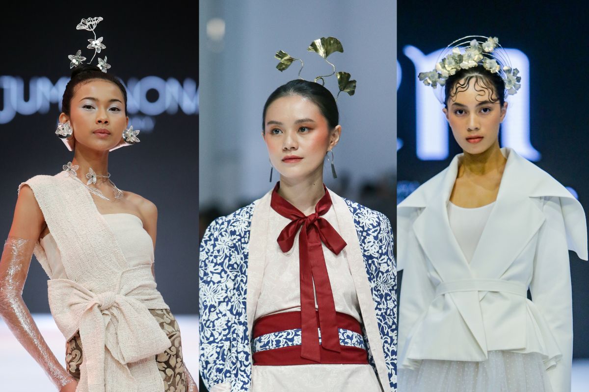 (Foto dari kiri ke kanan: Flower inspired tiara dalam show Jumpa Nona, Batik Trusmi, dan Eri)