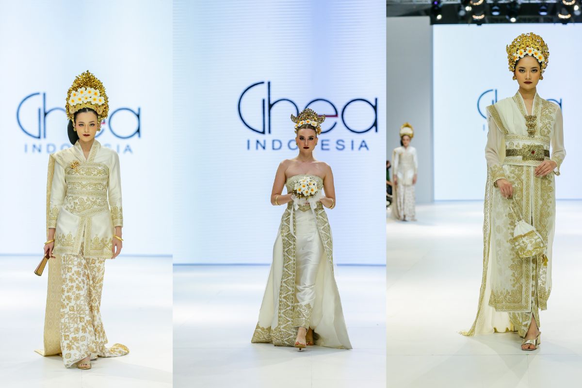 Ghea Panggabean menghadirkan gaun pengantin terinspirasi busana pengantin Bali. Berbeda dengan busana pengantin tradisional Bali yang lebih berwarna, Ghea menonjolkan warna putih. Ia memperkuat kemewahan warna putih tersebut dengan cara menerapkan warna keemasan atau prada pada busana pengantin karyanya.