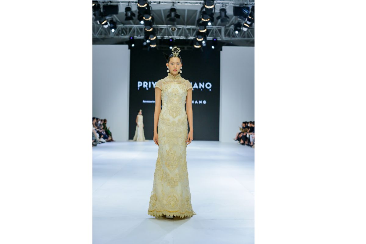 Priyo Oktaviano juga hadir membawa gaun pengantin tradisional khas Oriental Wedding melalui cheongsam karyanya. Cheongsam dengan nuansa putih keemasan ini semakin elegan dan feminin dengan potongan backless.