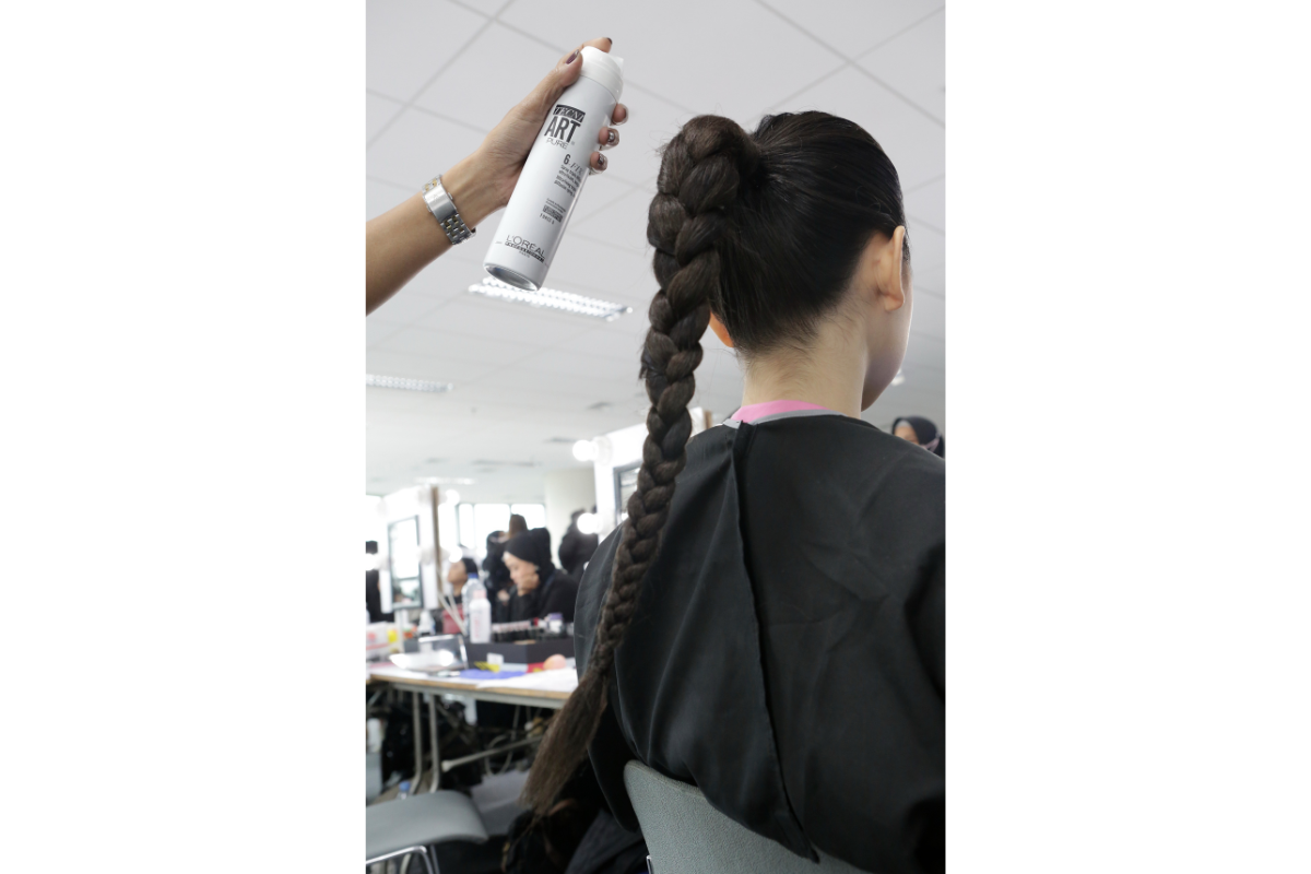 (Foto: Tim L’Oréal Professionnel mengaplikasikan produk serta menata rambut model sebelum show JFW 2023)