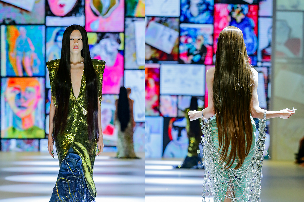 (Foto: Gaya rambut menggunakan extension rambut sangat panjang atau wig panjang dalam koleksi couture Yogie Pratama)