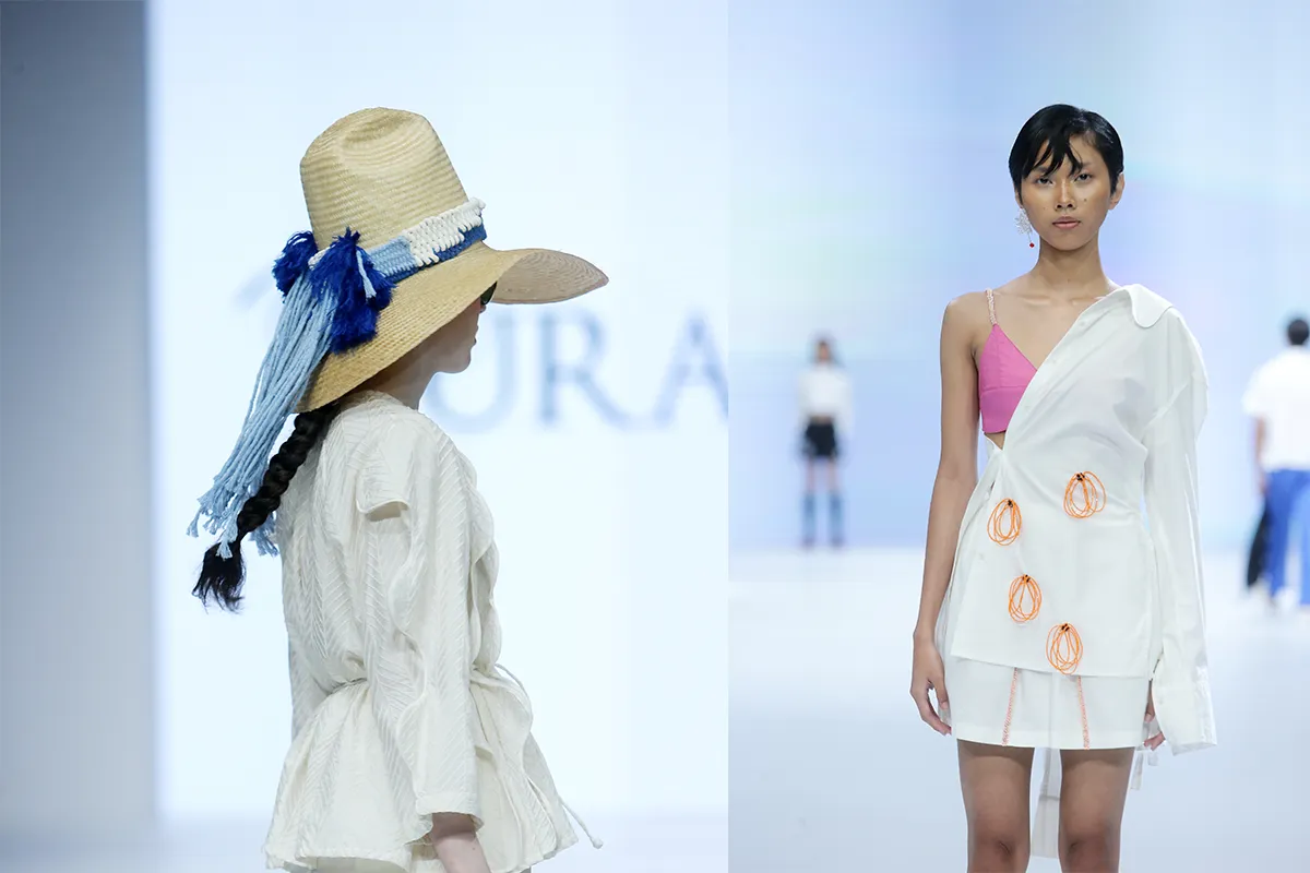 Selain itu, jenama Purana dalam rangkaian show Dewi's Luxe Market 'Cruise to Paradise' juga menampilkan sejumlah detail makrame sebagai pelengkap aksesori topi dan bando. Terbuat dari tali makrame tebal dengan warna kontras yang manis, unsur ikatan makrame ini nampak menonjol apik di atas anyaman natural berwarna cokelat muda.