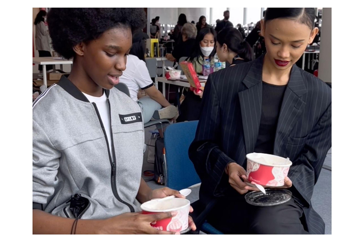 (Foto: Dua model menikmati Bowlgogi untuk makan siang, di antara kesibukan show sepanjang JFW 2023)
