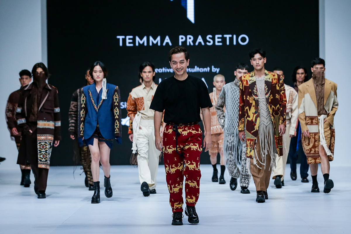 Desainer spesialis menswear Temma menggunakan tenun NTT ke dalam koleksi menswear formal yang banyak terdiri dari aneka luaran berbahu kuat dan potongan boxy. Melabuhkan pilihannya pada tipe-tipe motif yang lebih kontras dan bold mempertahankan sifat maskulin pada desainnya.
