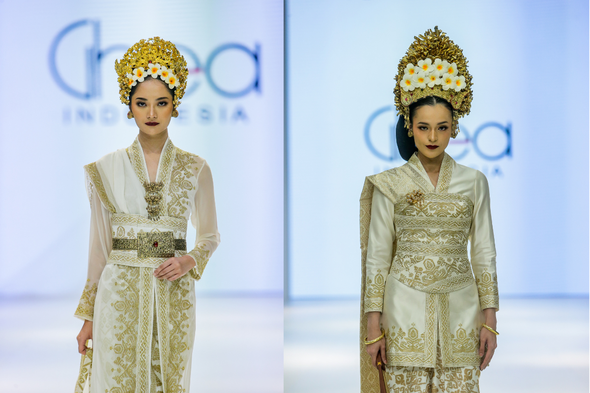 Berada satu runway dengan Era Soekamto, Ghea juga menghadirkan gaun pengantin dengan traditional looks. Ghea menghadirkan kebaya putih dengan detail keemasan tanpa lipatan di bagian kanan dan kiri dadanya. Di bagian pinggang, kebaya tersebut dililit dengan kain seperti yang biasanya dikenakan perempuan Bali.