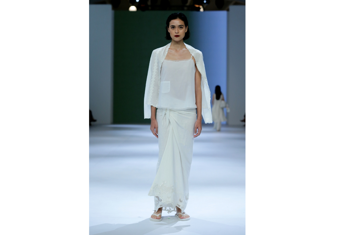 Desainer Ikatan Perancang Mode Indonesia (IPMI) ini membawakan kebaya kutubaru dengan pakem tradisional. Material lace putih yang elegan dilengkapi dengan kain batik wiron (berwiru) dengan material mengilap. Kebaya pengantin ini dipadukan dengan veil putih, ronce melati di sanggul, serta alas kaki berwarna senada.