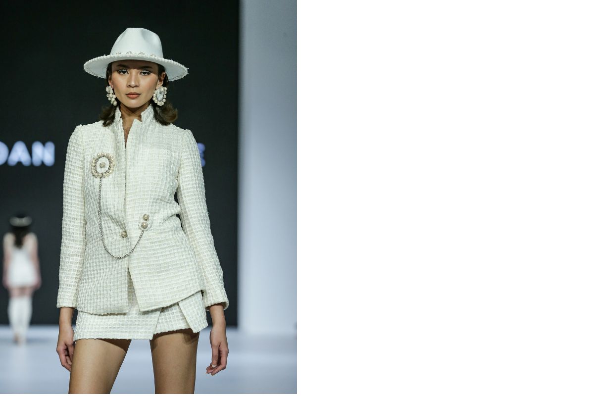Siapa yang bisa mengingkari elegansi dari suit dengan material tweed yang dihiasi mutiara dari Aidan and Ice? Bersiap saja menjadi pusat perhatian.