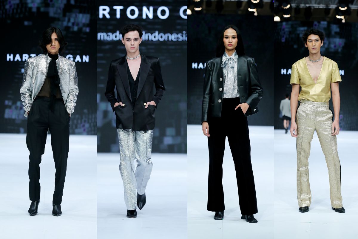 Salah satu desainer yang juga banyak membawakan warna-warna metalik adalah Hartono Gan. Ia menghadirkan pants, blazer, hingga atasan bermaterial metalik. Seperti Maryallè, Hartono juga bermain dengan turunan metalik dengan unsur warna lain yang lebih keemasan dan kekuningan.