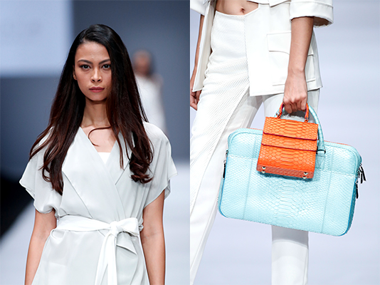 The opening show was Kyra by Shahira Habsy. The bag collection, Clairvoyance – My Dream Universe, presented in eights looks from four labels: Ardistia New York, Alan Tan, Reagita Zoro, and vatthu. All were in white to balance Kyra’s bags, which had pop colors, such as strawberry sorbet, orange, green, and blue. Made from high quality leather, the bags were stylish as well as functional.