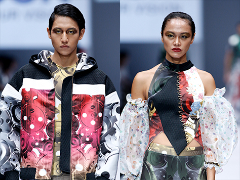 The label that directed by Andrea Risjad and Amot Syamsuri Muda, Sky.Inc, unveiled a collection with a title, BI.ON.INC. Its collection was inspired by technology, science fiction and extraterrestrial life and revealed in 48 designs. The monochromatic colors were combined with red, green, purple, and gold and presented in form of bell sleeves, cut out, one shoulder with patent leather as detail. The motives were various, from machine tier to computer chip.