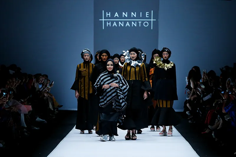Hannie brought forward Kediri’s Ikat in bamboo shoots and bold strips motives. Startlingly, the models were makeup in gothic to intensify the characteristic of the woven fabrics. Dominated in black and grey, some of Hanni’s collection gave mysterious impression, albeit combined with hijab. The last collection was batik with orange coloros, blend with black.