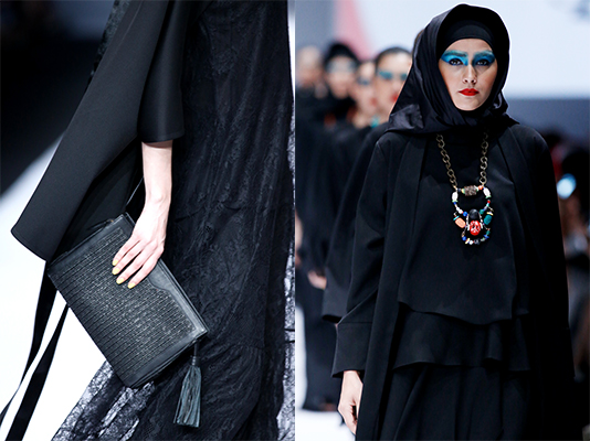 At first sequence, Mr Yunasz unfolded “The Dark Side”, a collection of Muslim clothing dominated in black with modern and edgy demeanor in kaftan and short gamis. Albeit in dark color, unique details such as pleats, embroidery, drapery, and bell sleeves injected contemporary touch and vitality. Yunasz succeeded in blending present-day in the ever-modest Muslim clothing and made them elegant.