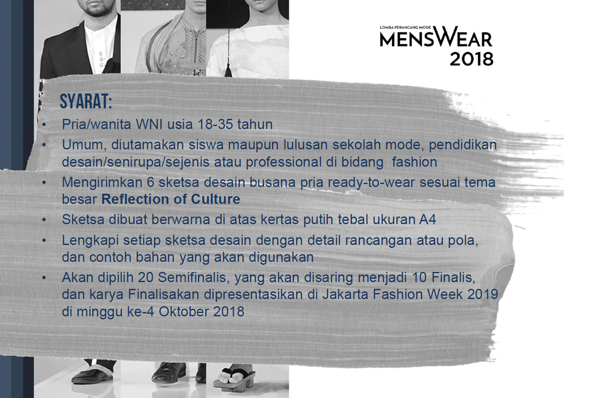 Tahun ini, mengusung tema Reflection of Culture, LPM Menswear kembali diadakan. Dilengkapi dengan roadshow ke daerah-daerah dengan dukungan BliBli.Com, ajang kali ini diharapkan dapat menjaring lebih banyak lagi talenta baru. Dapatkan informasi lengkap dan formulir dengan klik di sini.