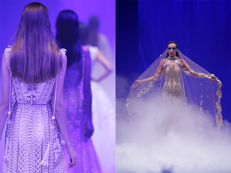 The sparkling sequins reflected every drop of shimmering pure water, enchanted in his dressed with title “Trism”. The dramatic stage added breath-taking dimension to the hand made dresses. It was intriguing with embroidery techniques and theatrical silhouettes, and Tex undoubtedly succeeded in creating a moment, not merely media-worthy, but also eye-worthy with those long dresses.