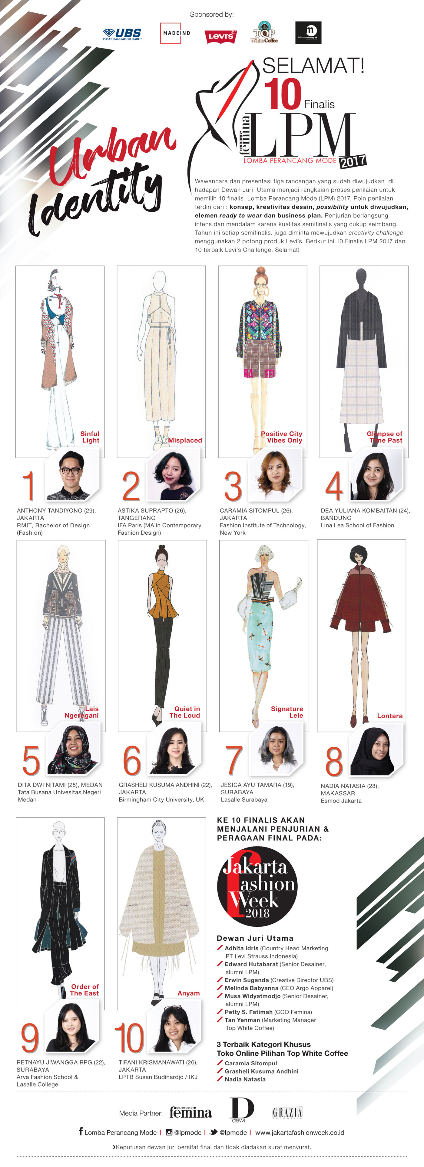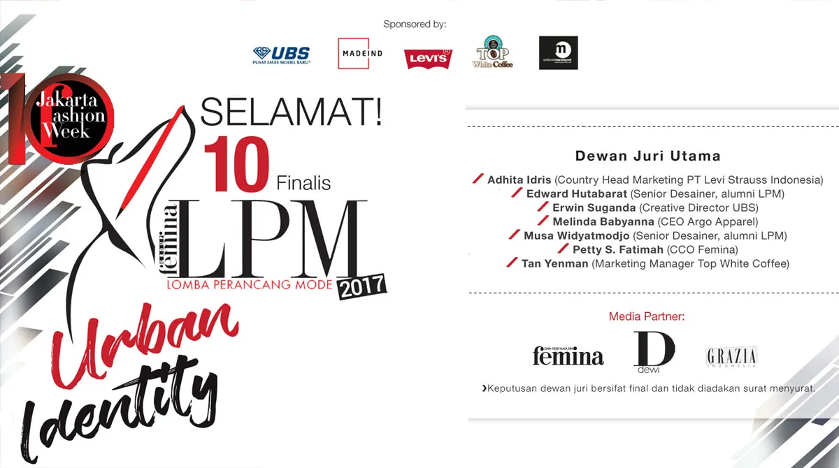 Info seputar LPM Femina Group 2017 dapat diakses di www.jakartafashionweek.co.id/lomba-perancang-mode/ atau laman Facebook: Lomba Perancang Mode, Twitter: @lpmode, dan Instagram @LPMode.