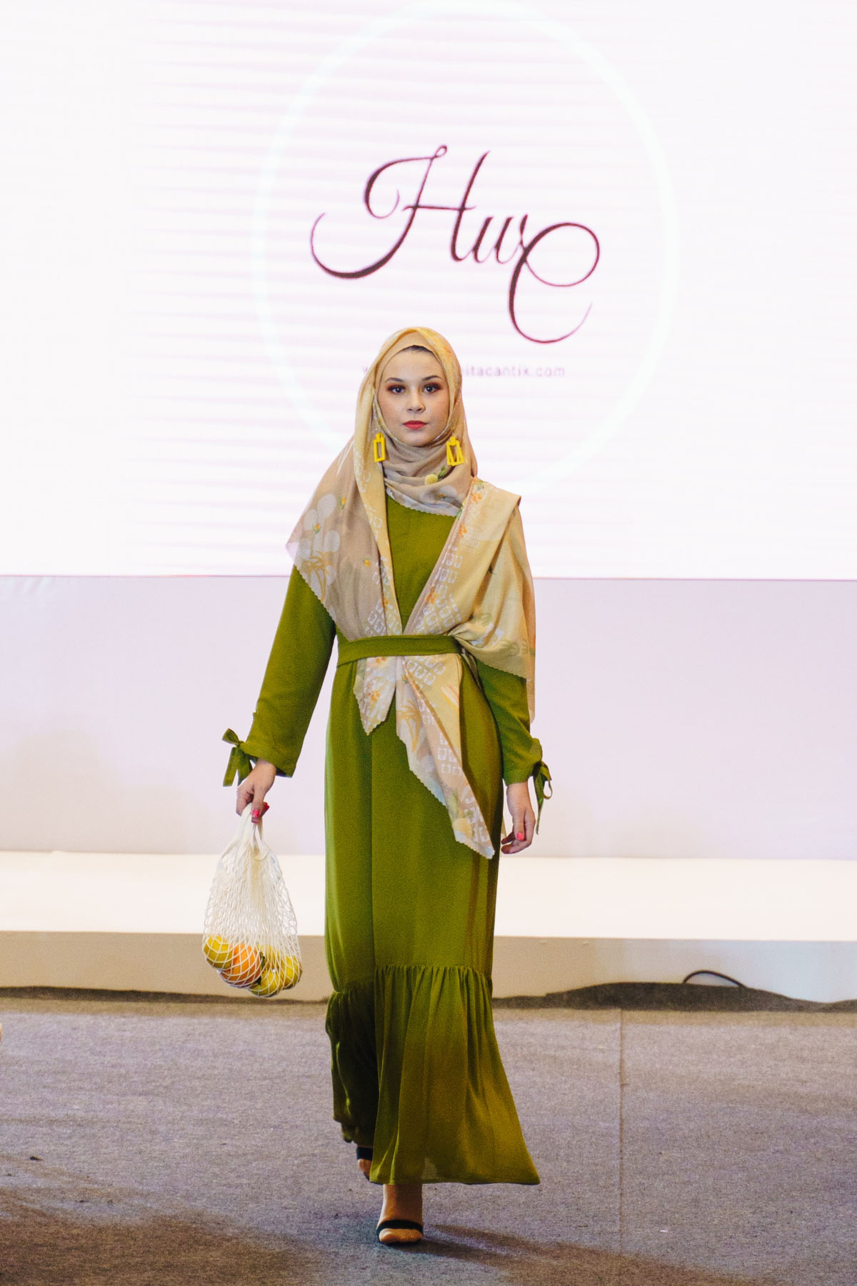 Tema tersebut dituangkan dalam permainan warna-warna pastel seperti peach, cream, dan hijau dengan model busana terusan yang terlihat simpel juga elegan.
