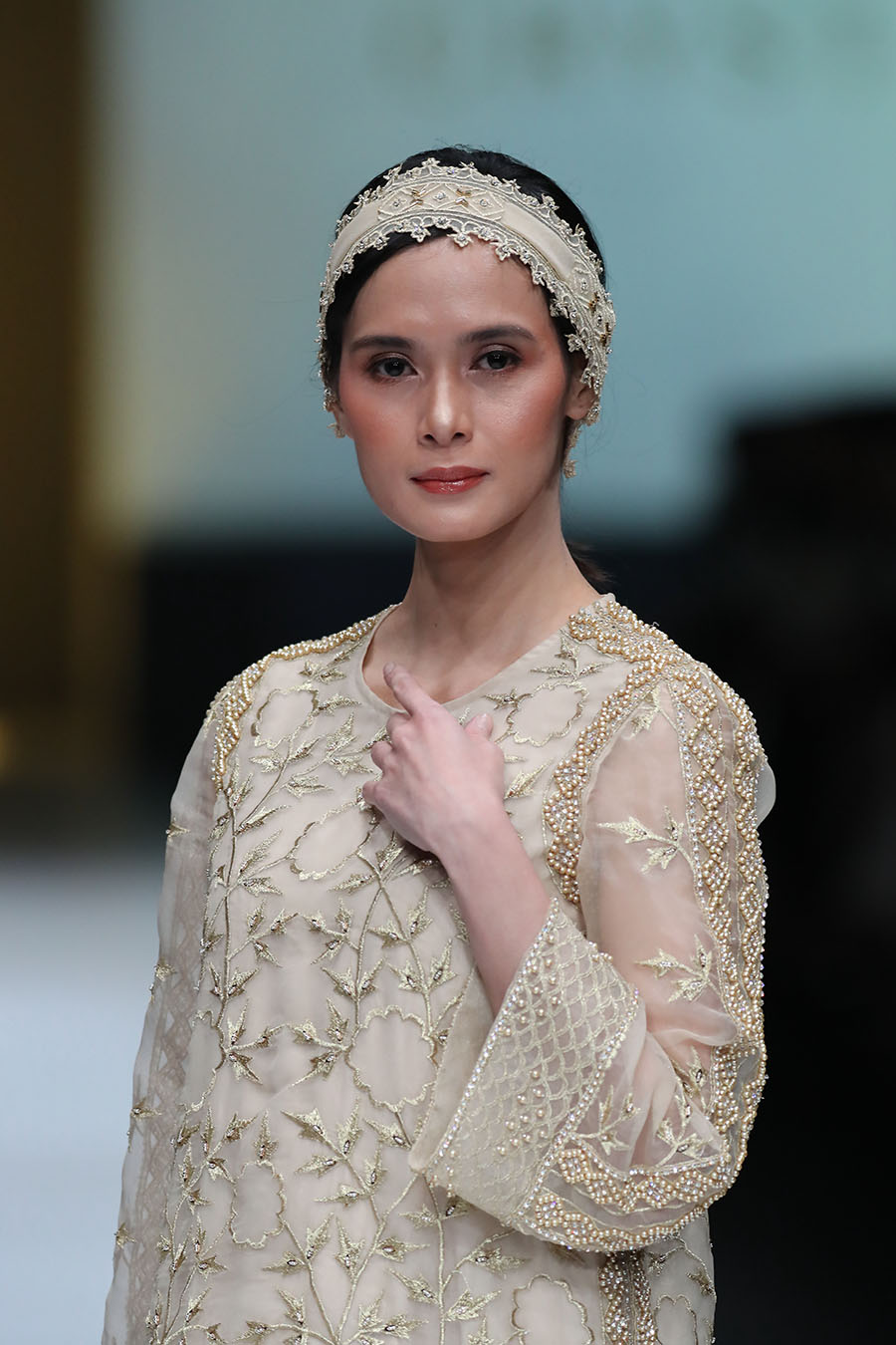 Warna gold dan nude yang digunakan pada koleksinya didapat dari warna Crystallure by Wardah. Ini terlihat dari detail beading dan embroiderry dari benang-benang emas yang diaplikasikan ke dalam bahan sutra chiffon, organdi dan habutay.