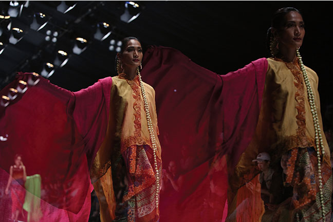 Konsisten dengan menggunakan kain yang kental dengan budaya Tanah Air, BINHouse menggelar peragaan busana bertema “Rayuan Kain” di Jakarta Fashion Week (JFW) 2020 Senayan City, Jakarta, Kamis (24/10).