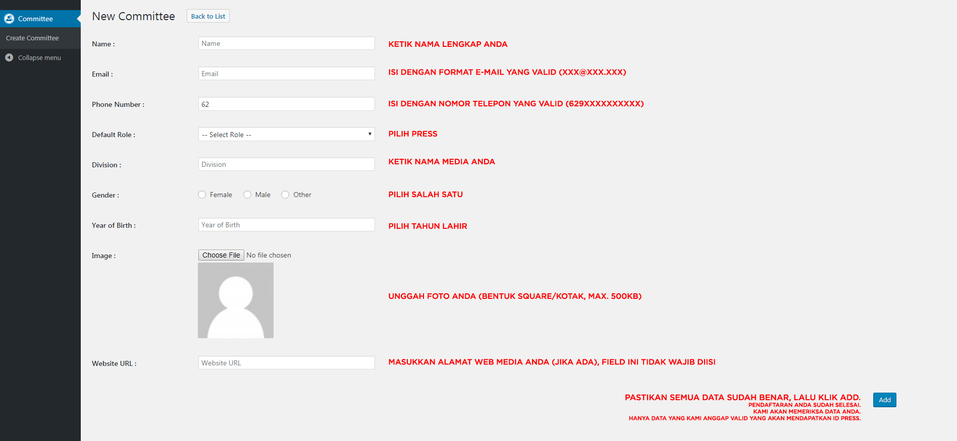 - Setiap hari, rekan media wajib melaporkan diri (Registrasi Harian) di Media Center sebelum melakukan liputan. Tim Registrasi dari Media Center akan menandai Press ID sebagai tanda sudah melapor. Rekan media yang belum melapor tidak diperbolehkan meliput.