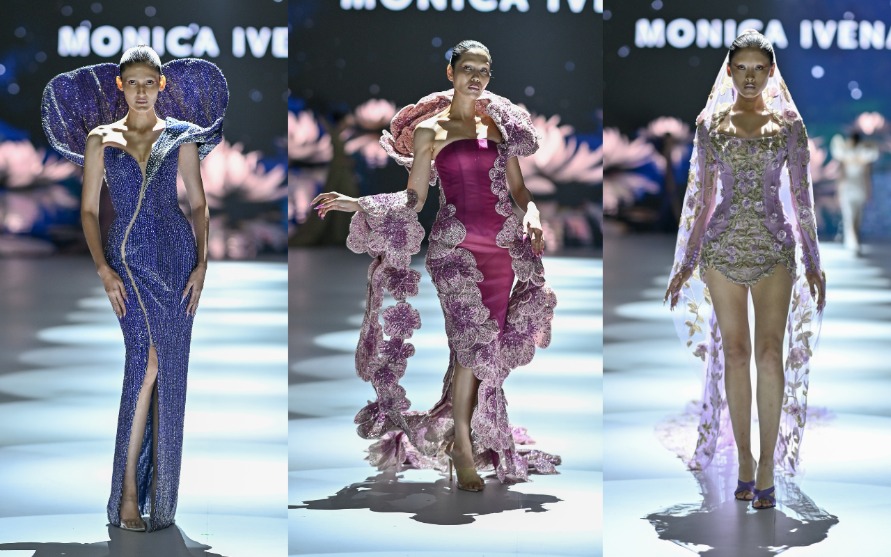 Sebagai desainer yang dikenal dengan craftsmanship dan ketelitiannya, Monica Ivena menaburi seluruh gaun-gaunnya dengan kilau berlian dan payet, ditambah dengan pilihan kain yang mengilap anggun. Warna yang dipilih seperti ungu, nude, dan pink mewakili keanggunan dan keindahan seorang wanita yang sesungguhnya.