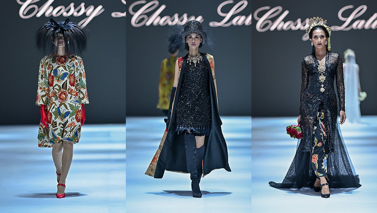 Busana batik motif bunga dengan warna-warna yang cerah hadir sebagai pembuka sesi show Chossy Latu, dikenakan bersama boots tinggi dan headpiece raksasa yang membuat statement. Pada look lainnya, batik motif bunga ini dipadukan dengan gaun, setelan, dan jumpsuit yang menggunakan materi sequin yang berkilau dan glamor, menyerupai gaun flapper yang vintage.