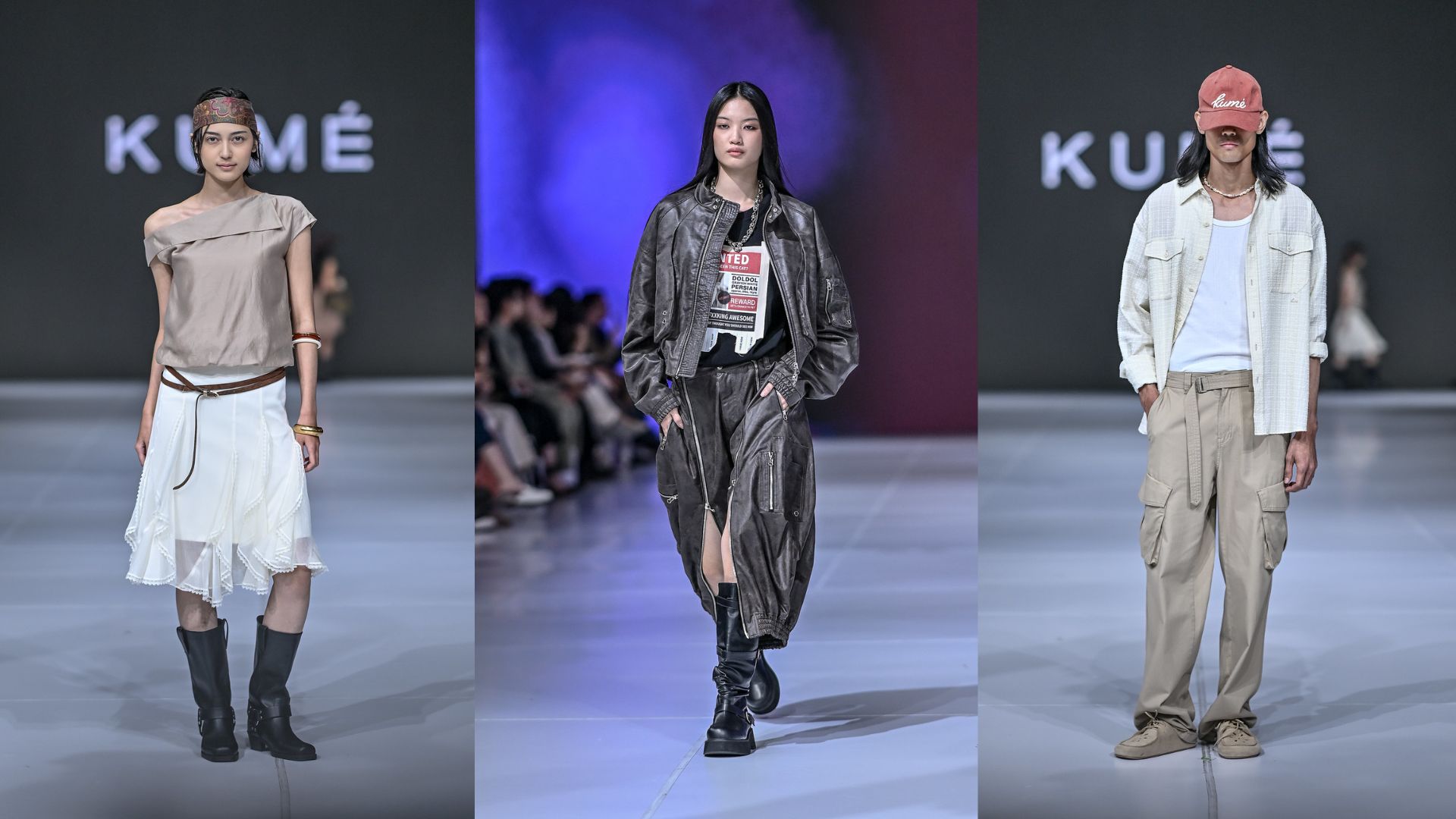 Suasana di panggung siang itu terasa hangat dengan cahaya matahari yang menembus langit-langit venue membalut koleksi KUMÉ yang membuka peragaan dengan kelembutan khas countrycore dan bohemian. Lightwashed denim, kemeja flanel pastel, serta rok A-line ringan bergerak anggun mengikuti langkah model di runway. Sentuhan topi koboi juga diselipkan untuk memperkaya karakter western-farm yang diterjemahkan dalam gaya urban masa kini, kasual, lembut, dan tetap berkelas.