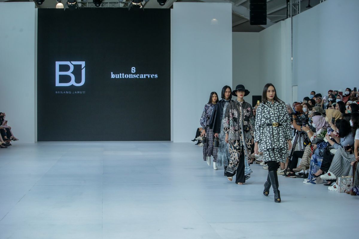 Benang Jarum dan Buttonscarves menampilkan koleksinya bersama tujuh jenama lain dari desainer modest wear kenamaan nasional, yaitu CALLA The Label, Dian Pelangi, ETU by Restu Anggraini, Itang Yunasz, Jenahara, Kami., Nadjani, serta Vivi Zubedi.