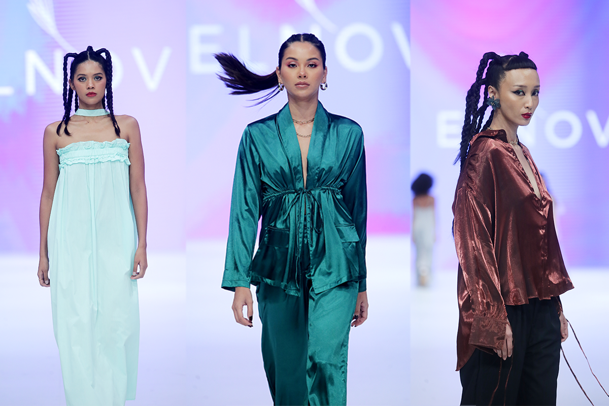 Jenama terakhir malam ini adalah Elnov dengan koleksi eveningwear yang terinspirasi dari hari-hari perayaan Natal dan Tahun Baru. Koleksi kali ini banyak menggunakan kain satin yang mengilap mewah digunakan dalam desain gaun drape yang banyak mengambil inspirasi versi modern dari gaun chiton khas Yunani Kuno.