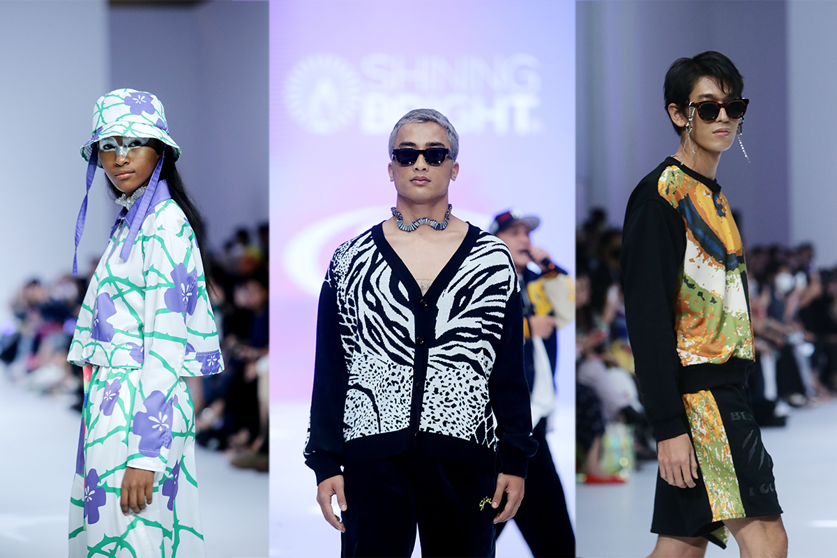 Kemudian dilanjutkan oleh show dari Shining Bright bersama Rider membawa tema Primitive Jungle. Koleksi ini banyak bermain dengan kreasi motif ilustrasi yang terinspirasi dari hutan dan hewan. Motif-motif corak macan dibuat lebih modern dengan pilihan warna hitam putih, ilustrasi bunga rafflesia arnoldi dan venus flytrap. Selain dari artikel-artikel knitwear seperti cardigan dan sweater vest, dan model-model pakaian berpotongan semi loungewear, Shining Bright juga mengeluarkan sejumlah look yang lebih formal namun tetap eye catching seperti sebuah jas hitam dengan lapel bercorak dan dekorasi patchwork bunga merah mencolok.