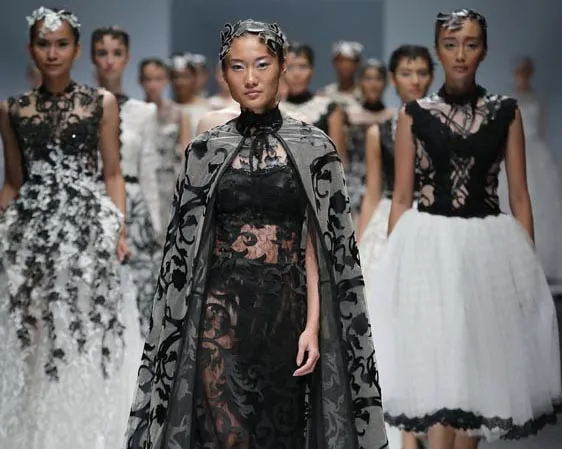 Her signature wedding dress was shown in the last sequence. Four fancy ivory dresses demonstrated the delicate perfection of her creation, with complicated details done very neatly. One dress is a white-silver sparkling gown with tiny leaves details, in the next one Yenty showed a tight-fitting dress styled with transparent robe in vine patterns. Her exquisite lace works is shown in the last piece, also complete with the sheer robe. And that marks all the enchanted fairytale beauty.
