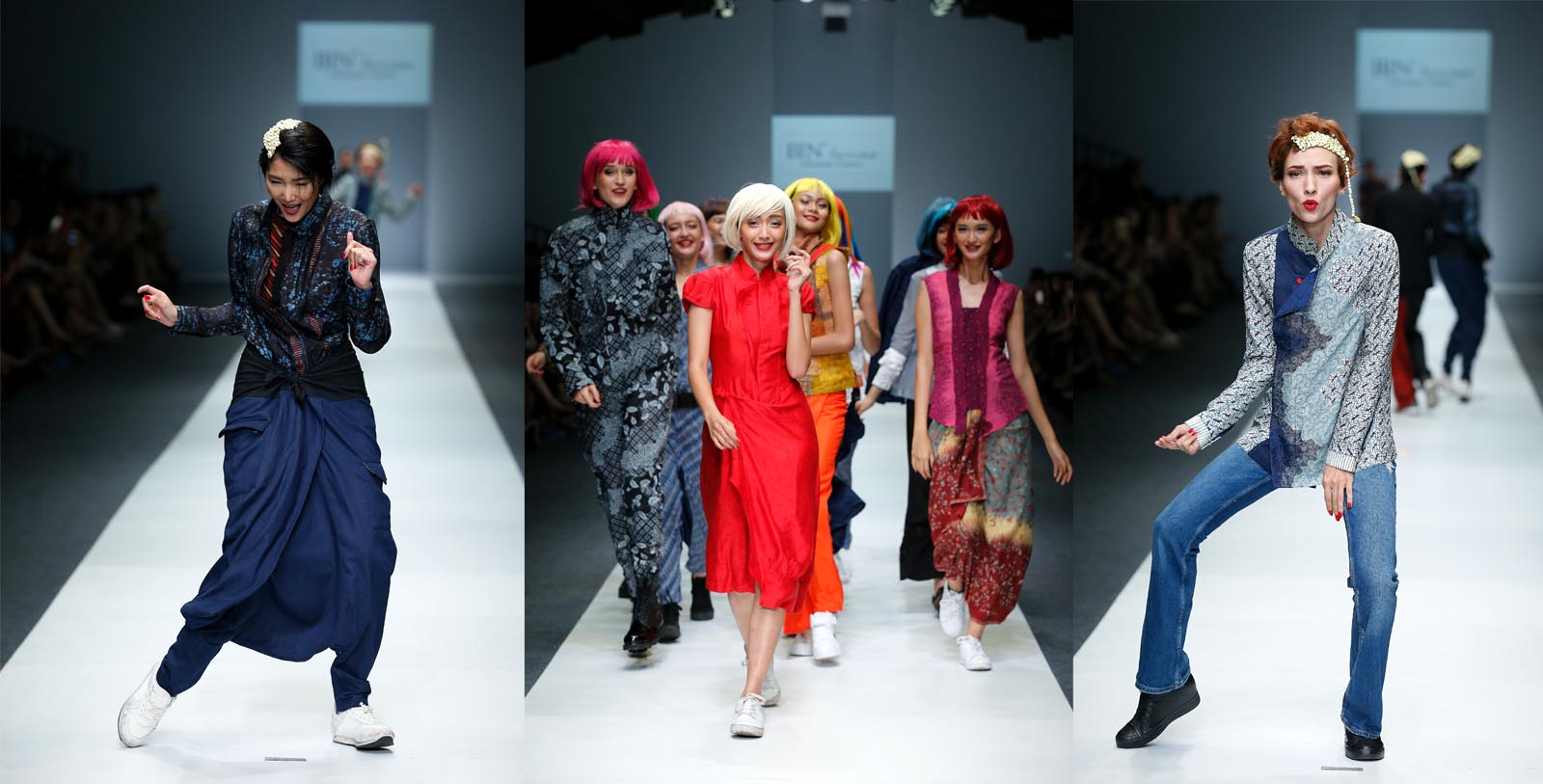 Josephine W. Komara, a designer known by the name O'Bin, bringing to mind Indonesian traditions through the opening demonstration on the fourth day of Jakarta Fashion Week. Under the BINhouse label; the design team of the fashion line; took inspiration from the city Jakarta interpreting it in the collection. Dominated by vibrant colors, the models danced down the runway.