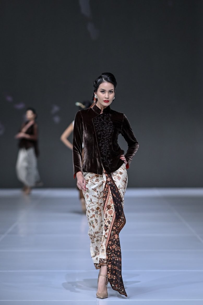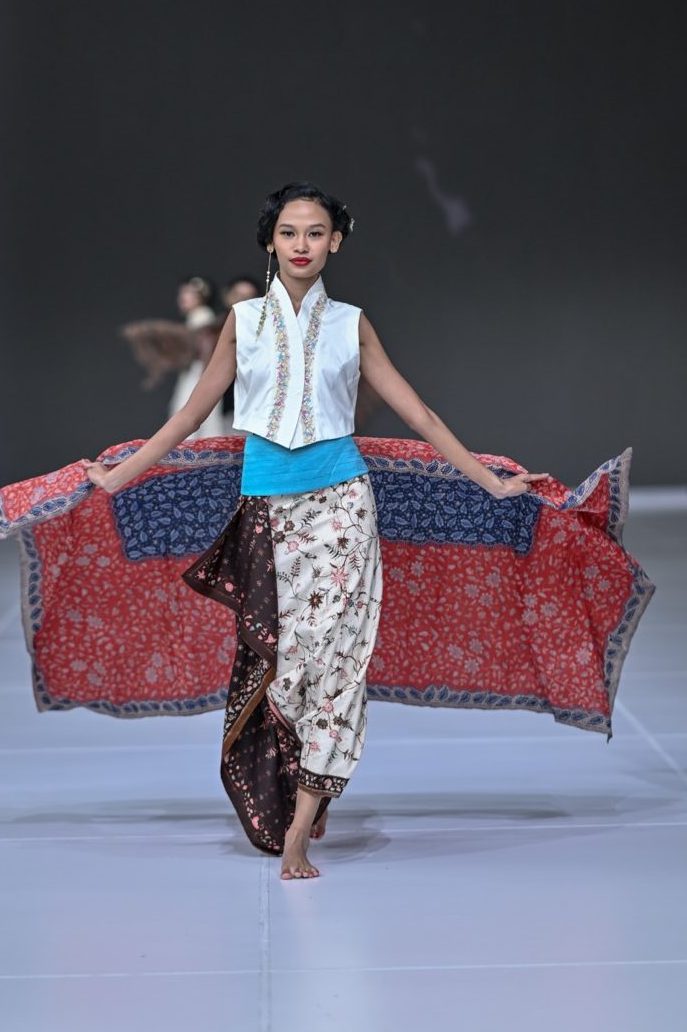 Ragam budaya Indonesia tergambar lewat adaptasi gaya yang luas, dari atasan kebaya bergaya qipao yang terinspirasi dari perempuan Tionghoa, hingga baju kurung yang merefleksikan keanggunan perempuan Melayu. Paduan ini berpadu manis dengan permainan warna yang berani dan berjiwa elegan, seperti biru navy yang kuat hingga kombinasi lembut merah muda dan hijau yang menyegarkan mata.