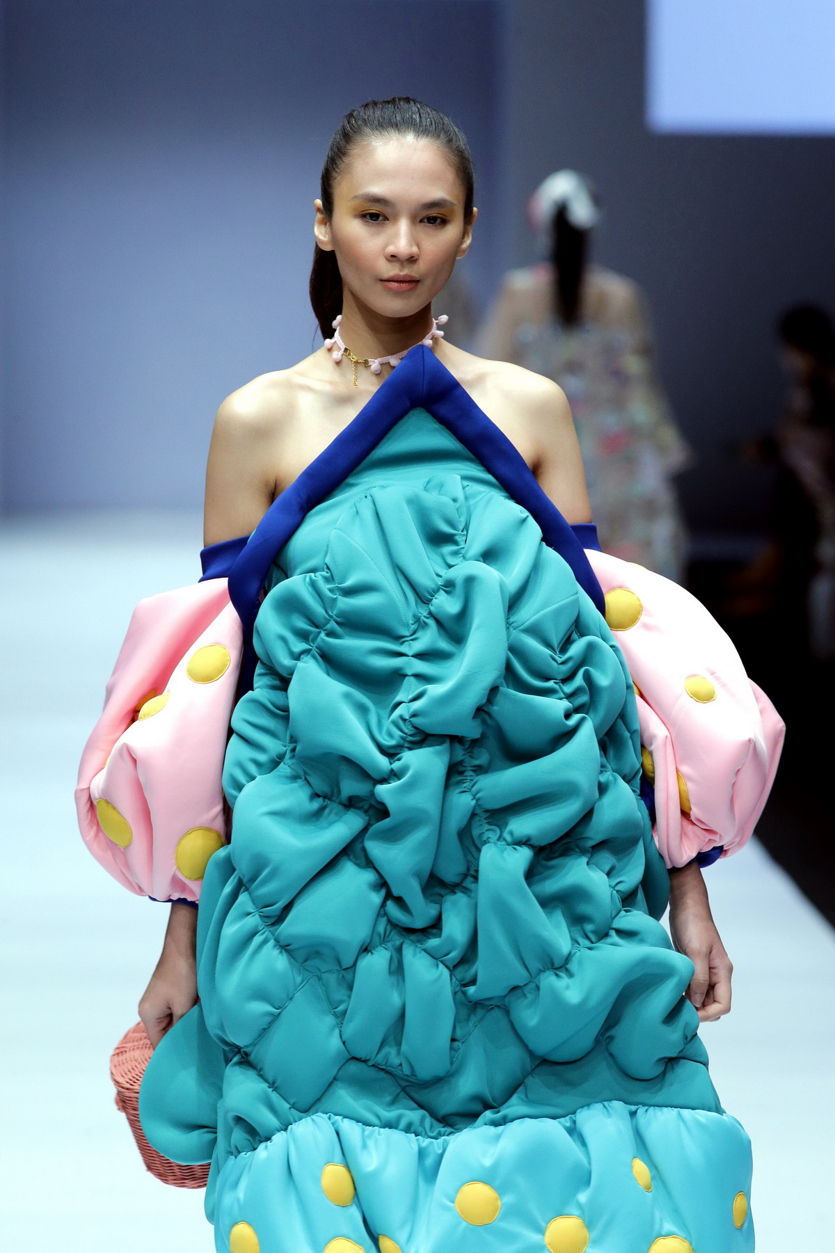 Memilih tosca, navy, dan pink untuk palet warna, koleksi ini menghadirkan siluet feminin dengan twist yang menggemaskan. Getaran yang unik dan retro dirasakan melalui pilihan warna dengan patch kartun yang menggambarkan merek klasik dari masa lalu.