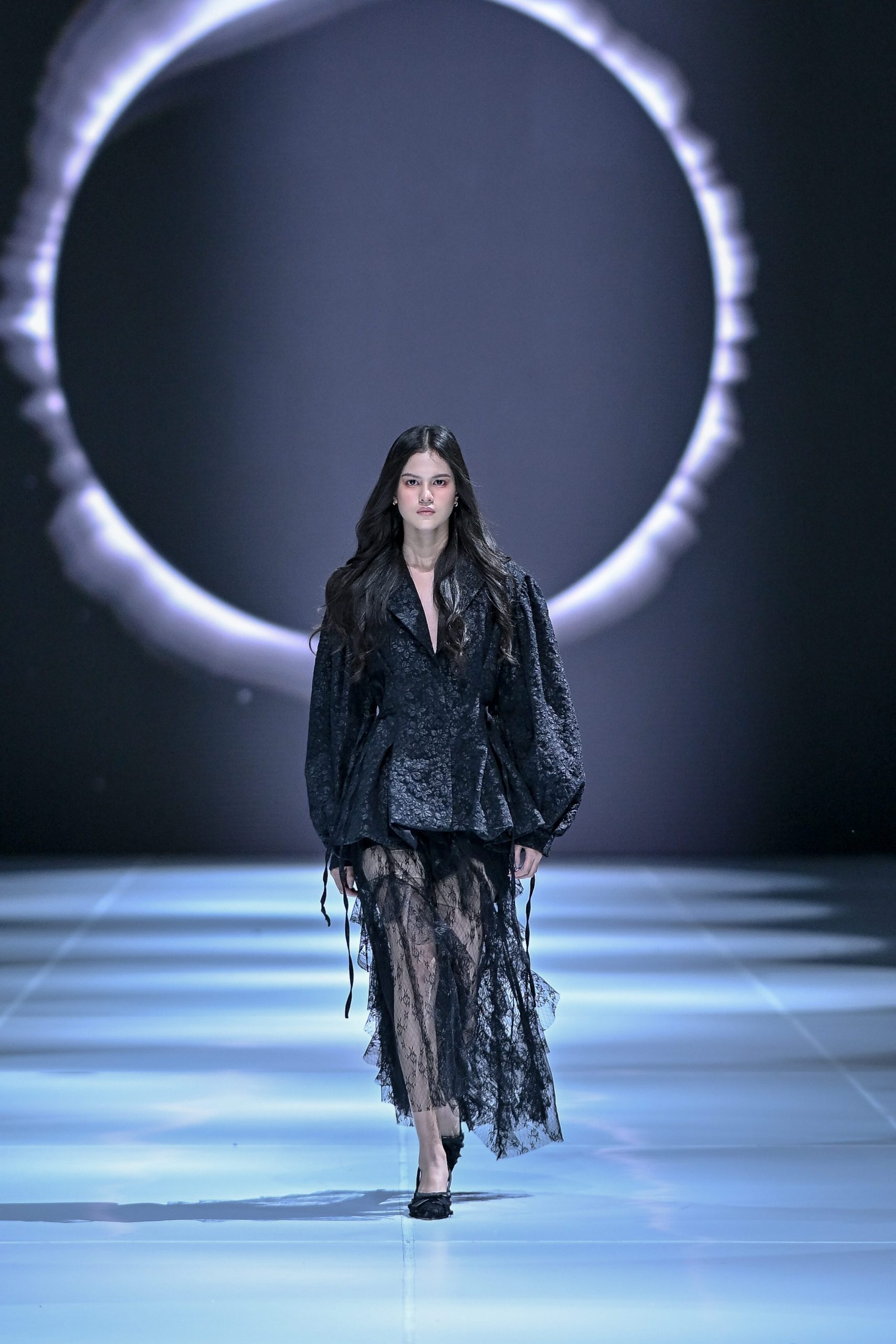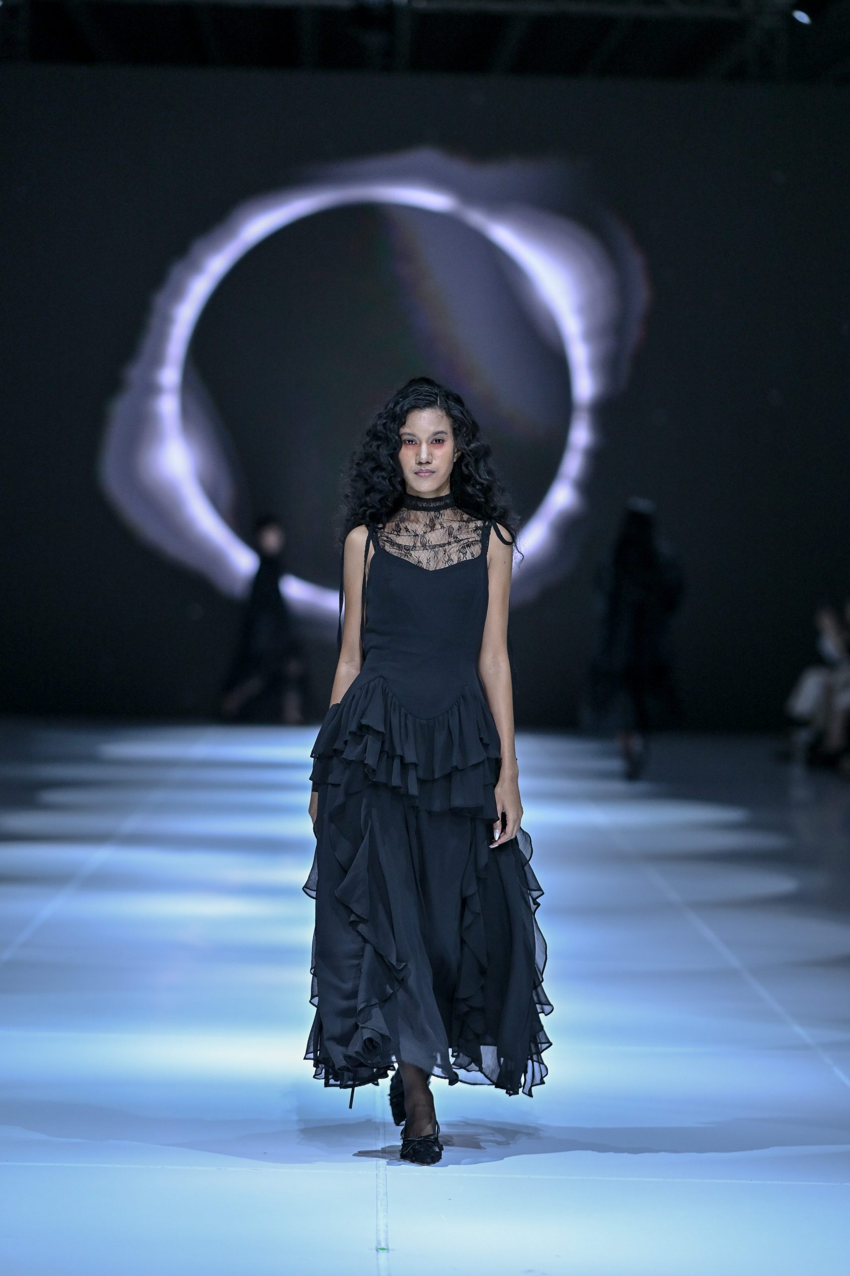 Dalam 16 tampilan, busana berlapis chiffon dan tulle terlihat misterius dalam warna hitam, menghadirkan nuansa gothic yang menghipnotis. Permainan veil, layered ruffles, dan balloon long sleeve top membentuk sebuah lanskap emosi di antara duka dan kebangkitan, antara kehilangan dan pencerahan.
